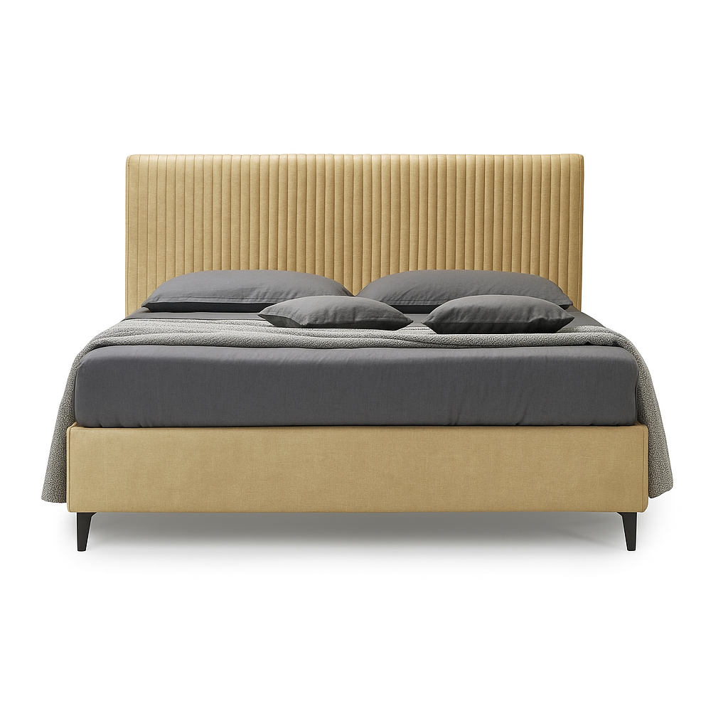 Il modello Dalì si distingue per la sua testata dalla presenza elegante, progettata per offrire comfort di appoggio e una resa estetica impeccabile. La sua struttura combina materiali di qualità, con fusto in truciolare e masonite e imbottitura in gomma, garantendo resistenza e morbidezza.